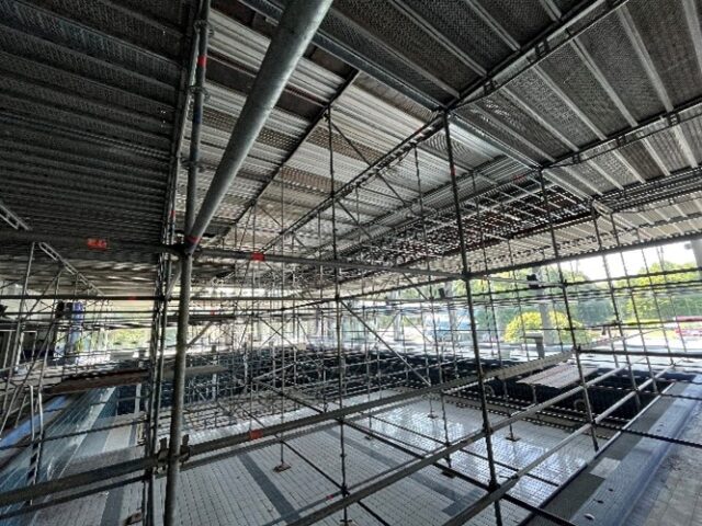 Folgende Arbeiten wurden bis dato u.a. durchgeführt: Installation eines Raumgerüstes, Demontage Abhangdecke, Dachträgerprüfung und Instandhaltung, Erneuerung der innenliegenden Traversenaufhängung, Erneuerung der Innenbeleuchtung (LED), Remontage Abhangdecke.